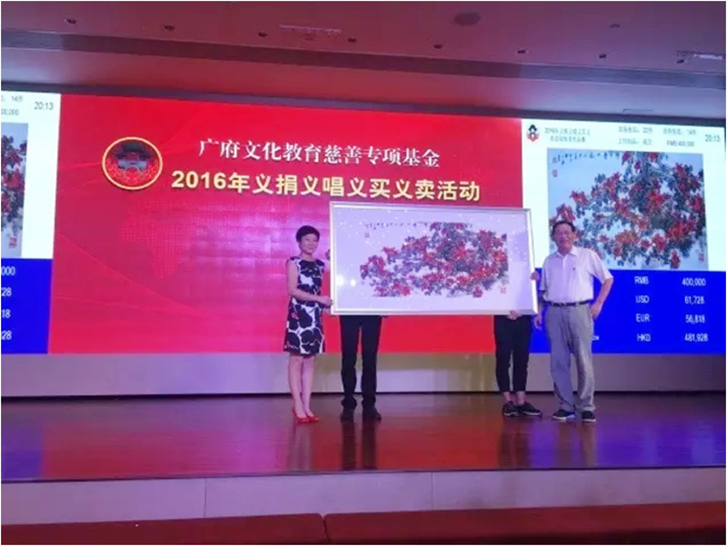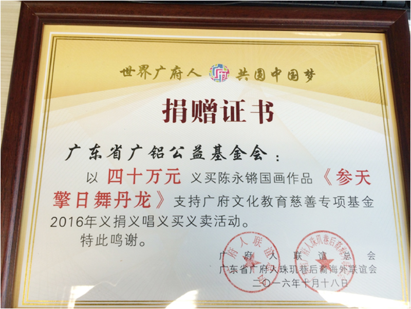 10月18日晚上,廣府文化教育慈善專(zhuān)項基金2016年義捐義唱義買(mǎi)義賣(mài)活動(dòng)在中國大酒店圓滿(mǎn)落幕,全場(chǎng)共籌得善款1060萬(wàn)元。 廣東省廣鋁公益基金會(huì )出席本次活動(dòng),并以40萬(wàn)元拍得作品——參天擎日舞丹龍/國畫(huà),為慈善事業(yè)獻出一份力量。