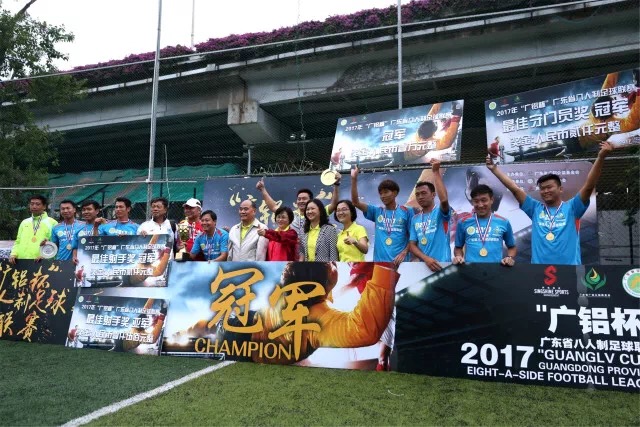 由廣東省足球協(xié)會(huì )擔任賽事指導,廣東省廣鋁公益基金會(huì )獨家冠名贊助并主辦,廣州聲色體育承辦的2017“廣鋁杯”廣東省八人制足球聯(lián)賽自6月24日開(kāi)賽起,得到梅州,東莞,韶關(guān),汕尾,佛山等地足協(xié)的支持,最終于上周末(10月14日、15日)在廣州市海珠區冠軍俱樂(lè )部舉行了總決賽。
