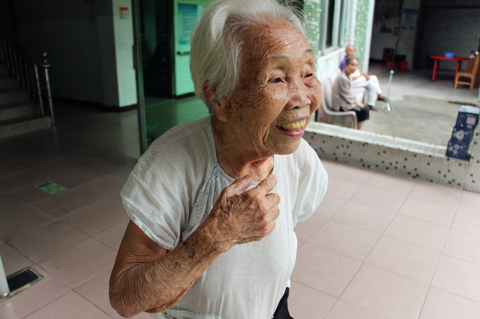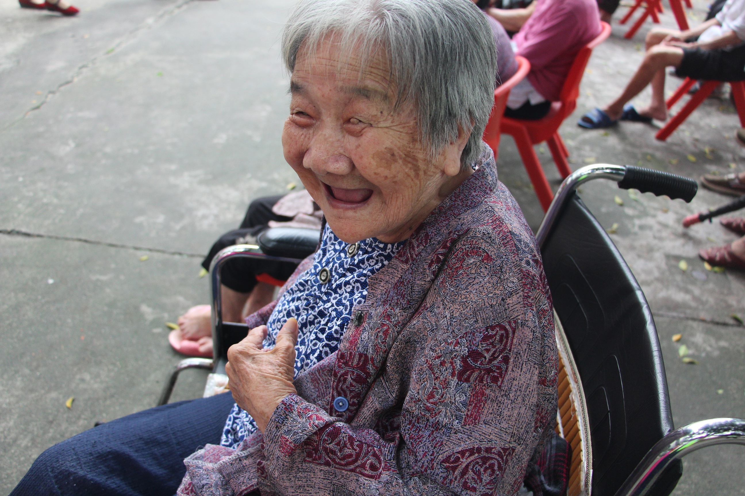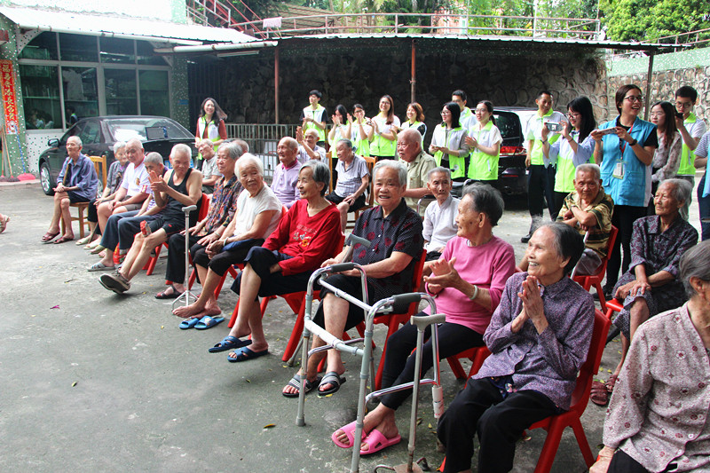 “我九十六歲了,我們以前很窮,很辛苦的,每天挑泥做苦力,就為了賺一口飯吃。你們讀大學(xué),做一份好工作,真的很叻(棒)。有空就帶禮物來(lái)送給我們,唱歌跳舞給我們這些老人看,你們真好,謝謝你們!”