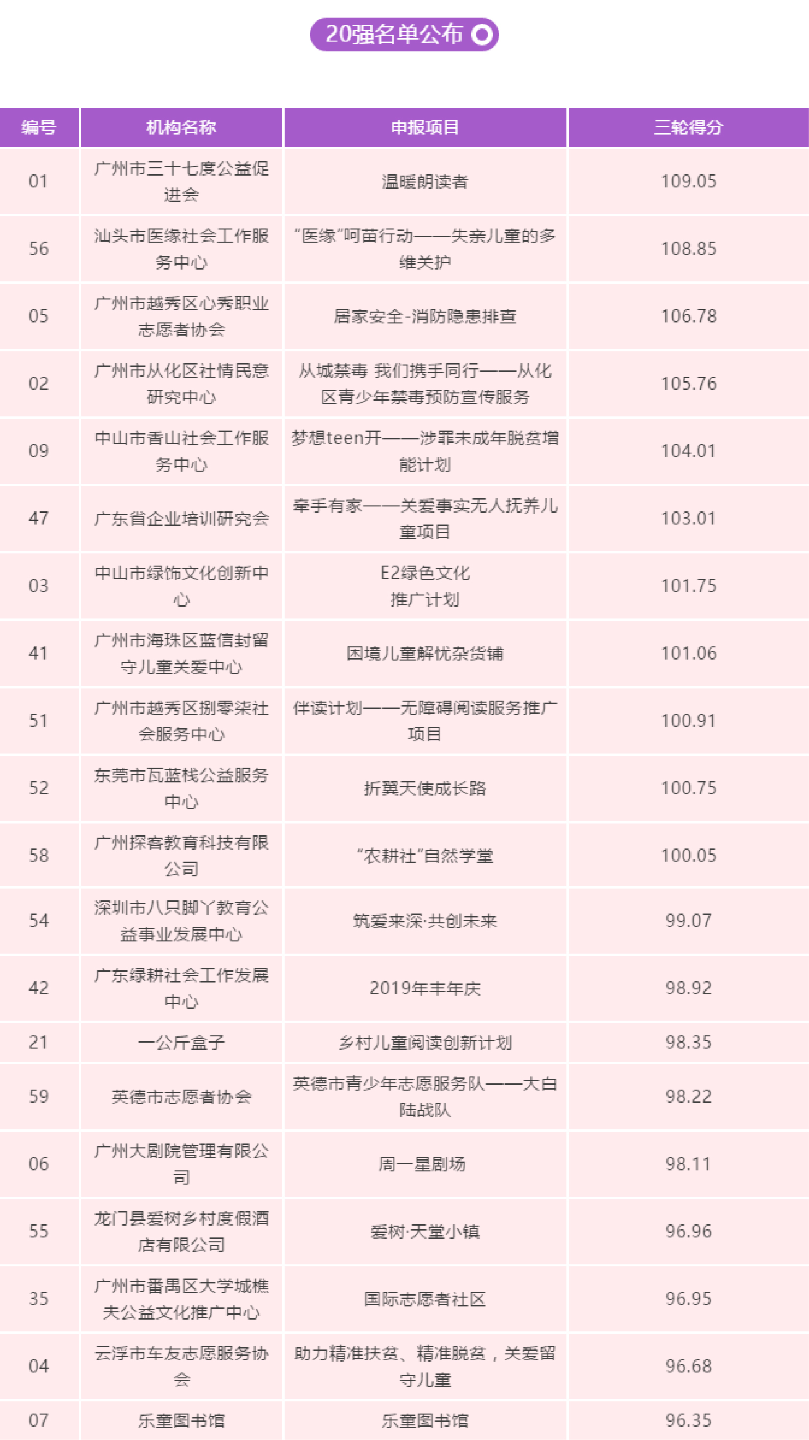 入圍的20強也將在7月27號(本周六)在佛山icc國際商業(yè)中心進(jìn)行地推展演,并最終評選出1個(gè)最佳公益項目,3個(gè)優(yōu)秀公益項目,6個(gè)新銳公益項目,10個(gè)最具成長(cháng)項目、1個(gè)最具創(chuàng )新項目、1個(gè)網(wǎng)絡(luò )人氣項目、1個(gè)最具傳播效應項目。歡迎大家到場(chǎng)支持,共同見(jiàn)證。