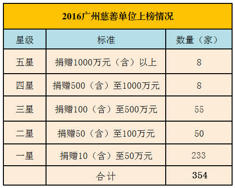 據了解,首屆廣州慈善單位上榜354家,其中五星(捐贈1000萬(wàn)元以上)8家,四星(捐贈500至1000萬(wàn)元)8家,三星(捐贈100至500萬(wàn)元)55家,二星(捐贈50至100萬(wàn)元)50家,一星(捐贈10至50萬(wàn)元)233家。