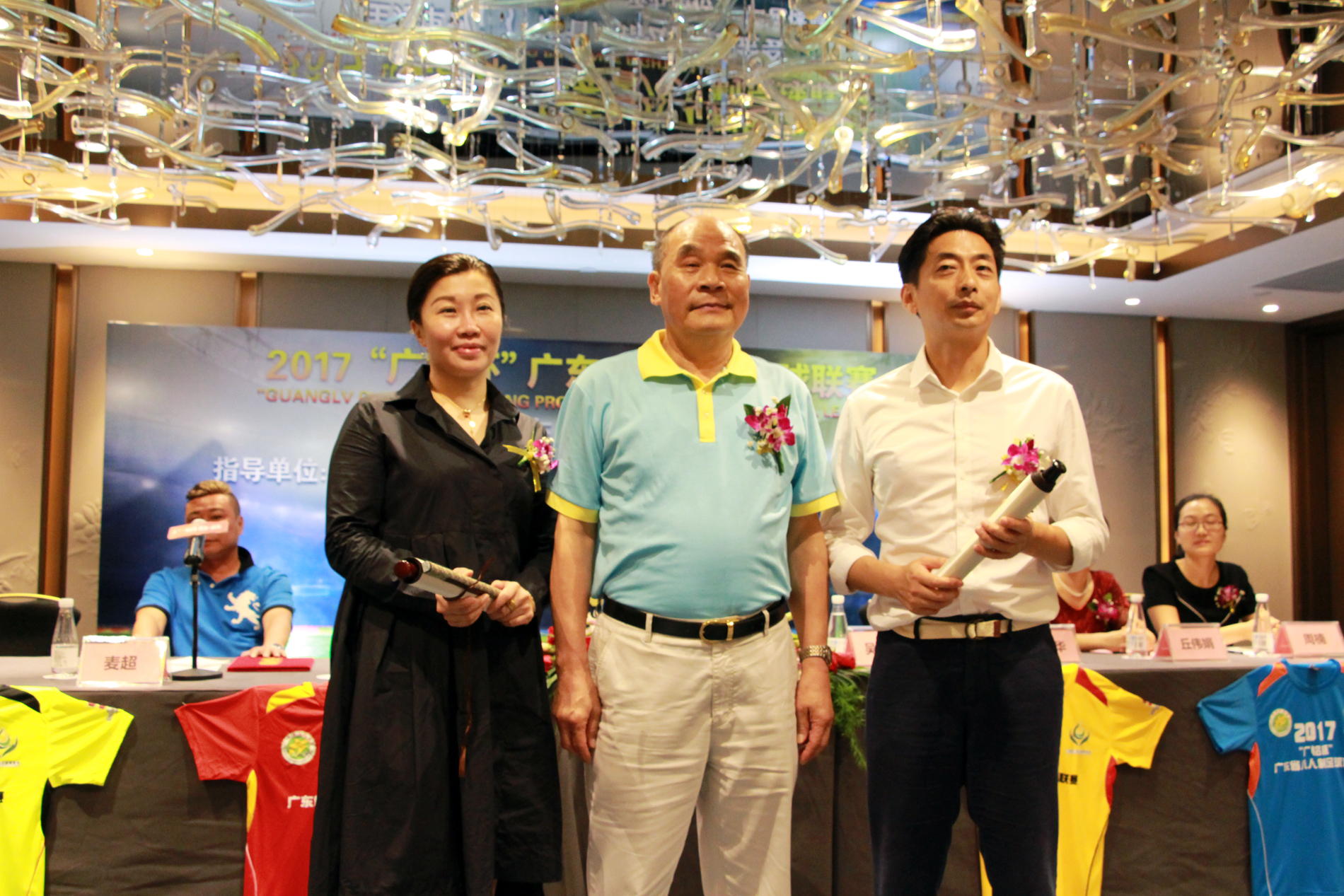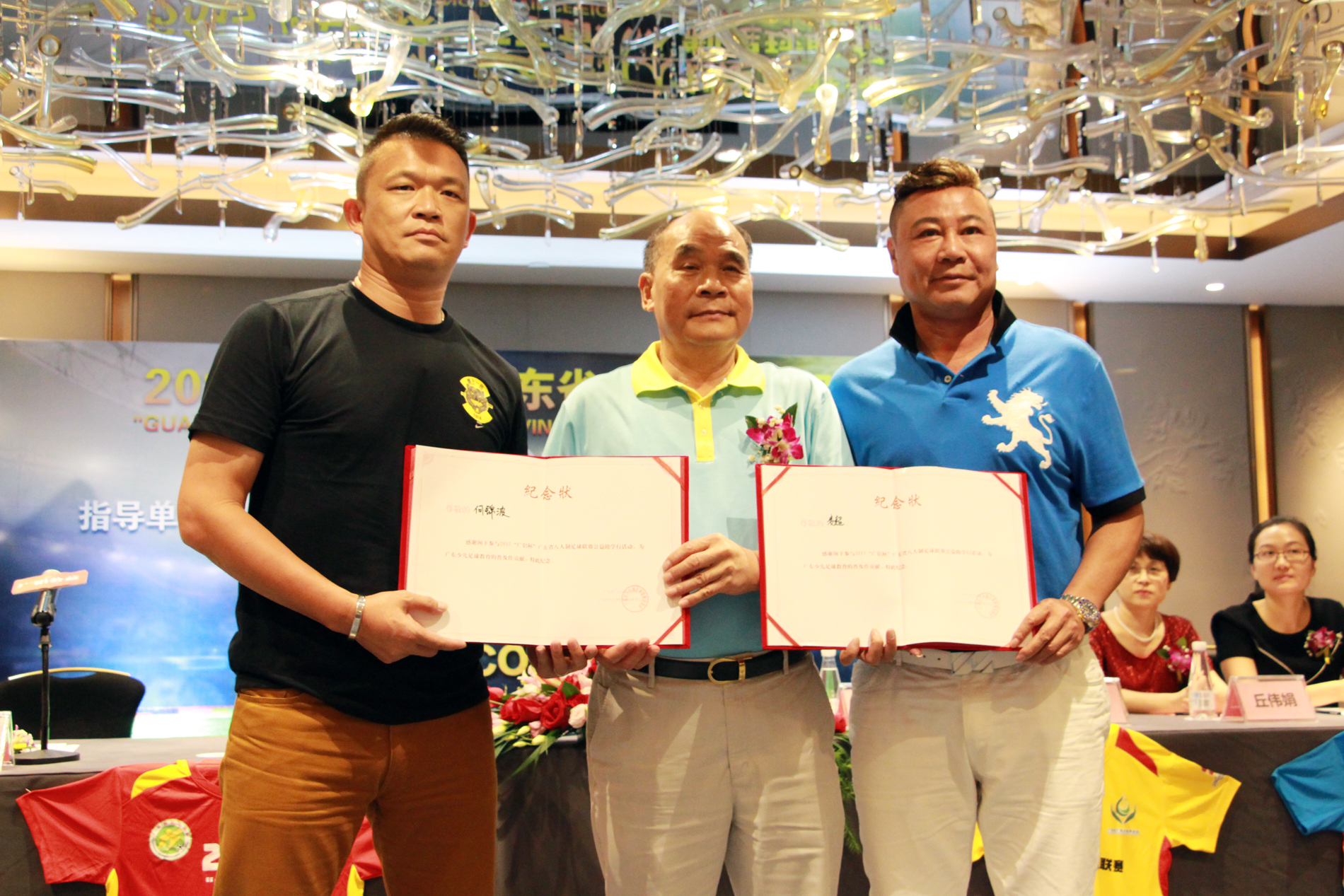廣鋁公益基金會(huì )理事長(cháng)吳作榮先生與廣東省足球協(xié)會(huì )副秘書(shū)長(cháng)席兵先生、聲色體育董事總經(jīng)理曾巧瑩女士交換禮品