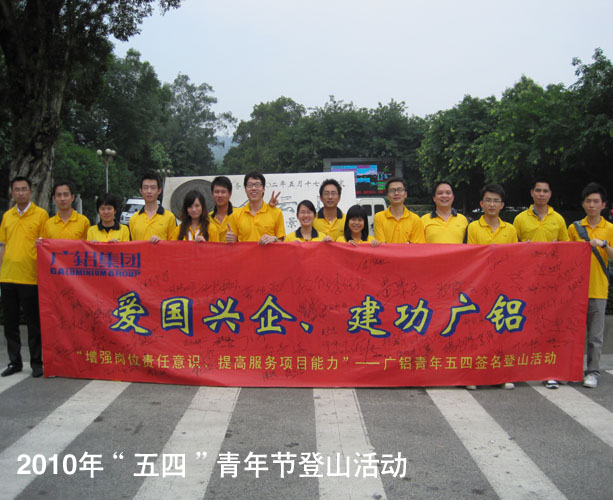 4月30日,集團公司40余名青年團員積極參加了廣鋁集團“愛(ài)國興企、建功廣鋁”簽名活動(dòng),活動(dòng)在公司行政辦公樓1樓會(huì )議廳敲響鑼聲。隨后,廣大青年團員向廣州著(zhù)名的景點(diǎn)——白云山奮勇進(jìn)發(fā),展現勇者的風(fēng)采與青春的飛揚。4月的白云山春意盎然,鳥(niǎo)語(yǔ)花香,鮮紅的廣鋁橫幅在蔥綠的白云山上顯得格外耀眼,在兩個(gè)多小時(shí)的登山過(guò)程中,我們欣賞著(zhù)沿途的美麗景色,歡聲笑語(yǔ)中已至最高峰。