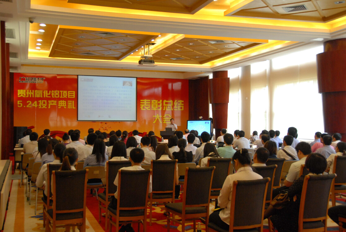 2012年6月9日,廣鋁集團在江高行政辦公樓二樓多功能廳舉行了貴州氧化鋁項目5.24投產(chǎn)典禮表彰總結大會(huì )。集團總部及各分公司中高層管理干部、投產(chǎn)典禮所有廣鋁工作人員出席了會(huì )議,貴州公司也通過(guò)視頻連線(xiàn)參加了本次大會(huì )。集團王常務(wù)副總裁在會(huì )上做了重要講話(huà),大會(huì )最后對貴州5.24投產(chǎn)典禮中表現突出的一批工作人員進(jìn)行了表彰。