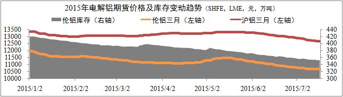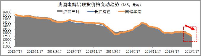 電解鋁現貨價(jià)格繼續回落。監控數據顯示,7月上旬電解鋁現貨價(jià)格繼續保持下滑趨勢,且下滑幅度有所擴大。截至7月17日,長(cháng)江有色現貨價(jià)格跌至12503元/噸,南儲華南跌至12543元/噸,月化日均跌幅分別為0.14%和0.15%,同比分別擴大0.03和0.05個(gè)百分點(diǎn)。從數據分布上看,目前現貨價(jià)格與滬鋁三月期貨價(jià)格之間的差值已收窄至100元左右,預計該趨勢將進(jìn)一步延續。