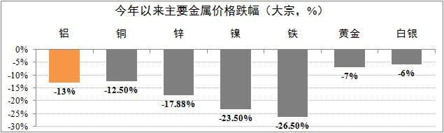 大宗商品價(jià)格走低。今年以來(lái),全球大宗商品價(jià)格出現顯著(zhù)下跌現象,并引起近期大宗商品的拋售潮。有色金屬全線(xiàn)潰退,其中,鋁價(jià)下跌13%、銅價(jià)下跌12.5%。大宗商品價(jià)格走低暗示著(zhù)全球經(jīng)濟增長(cháng)動(dòng)能相對缺失,綜合分析成因,主要包括以下三點(diǎn):一是大宗商品總體處于供過(guò)于求的狀態(tài);二是美元走強,9月份加息預期增強;三是新興市場(chǎng)經(jīng)濟體增長(cháng)疲軟。