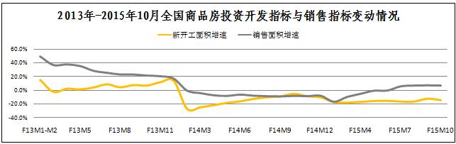 發(fā)稿時(shí)間:2015-11-20全國市場(chǎng)方面:國家統計局數據,10月份全國商品房新開(kāi)工面積累計同比降幅為-14.7%,跌幅環(huán)比擴大2.1個(gè)百分點(diǎn),銷(xiāo)售面積累計同比增速為7.2個(gè)百分點(diǎn),增幅環(huán)比下跌0.3個(gè)百分點(diǎn)。10月份全國房地產(chǎn)投資開(kāi)發(fā)指標與銷(xiāo)售指標表現不佳,拖累國房景氣指數連續兩個(gè)月下跌,其中10月份國房景氣指數為93.34,較9月份下跌了0.06點(diǎn)。