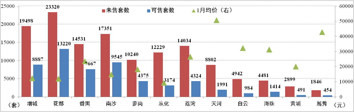截止2月10日,廣州市新建住宅商品房共190,699套,環(huán)比減少2.72%。其中可售和未售房源分別為56,526套和134,173套,主要集中在花都、增城、南沙以及番禺四區,合計分別占69.7%和55.7%;增城分別占15.7%和14.5%。
