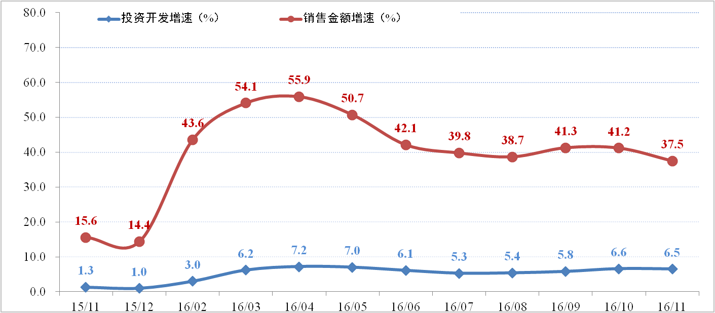 開(kāi)發(fā)投資方面:2016年1-12月份,全國房地產(chǎn)開(kāi)發(fā)投資同比增長(cháng)6.9%,增速環(huán)比增加0.4百分點(diǎn)。其中,住宅投資增長(cháng)6.4%,增速環(huán)比提高0.4個(gè)百分點(diǎn)。住宅投資占房地產(chǎn)開(kāi)發(fā)投資的比重為67.0%。