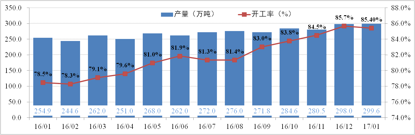 供給方面:2月10日,全國電解鋁有效產(chǎn)能為4,226.6萬(wàn)噸,運行產(chǎn)能37萬(wàn)37.5噸,開(kāi)工率為88.42%。其中,1月份電解鋁總產(chǎn)量為299.6萬(wàn)噸,供應持續增加。調研數據顯示,2017年電解鋁新產(chǎn)能已投產(chǎn)98.1萬(wàn)噸,預計年度最終實(shí)現588.5萬(wàn)噸;電解鋁復產(chǎn)21.2萬(wàn)噸,預計年內最終實(shí)現152萬(wàn)噸。