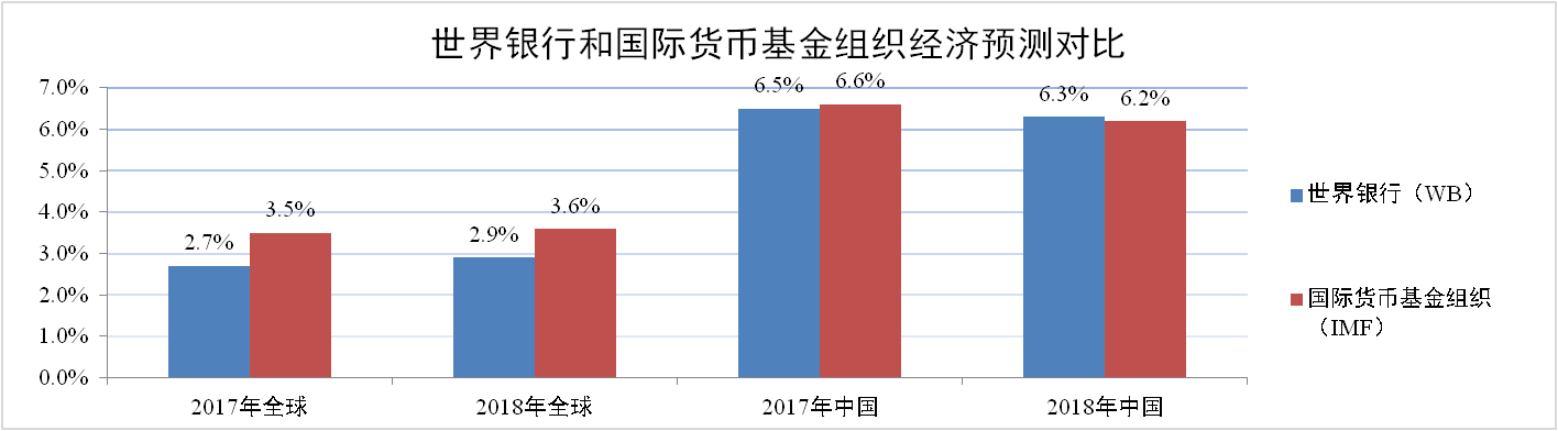 世界銀行2017年6月《全球經(jīng)濟展望》數據顯示,隨著(zhù)制造業(yè)和貿易回暖以及大宗商品價(jià)格趨穩,預計2017年和2018年全球經(jīng)濟增速分別為2.7%和2.9%;發(fā)達經(jīng)濟體經(jīng)濟增速分別為1.9%和1.8%;新興市場(chǎng)和發(fā)展中經(jīng)濟體經(jīng)濟增速分別為4.1%和4.5%;中國經(jīng)濟增速分別為6.5%和6.3%。