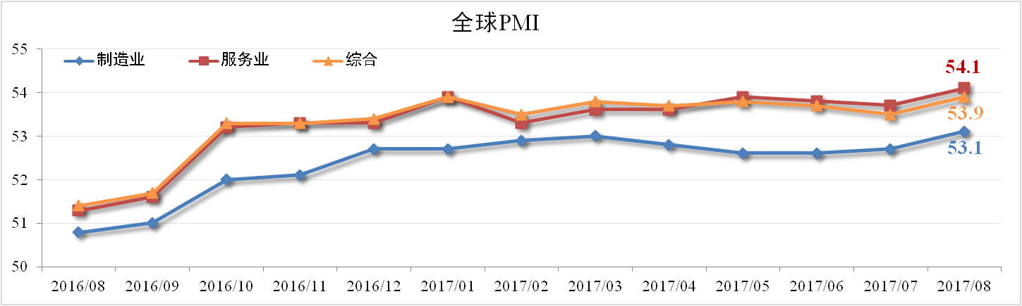 據HIS Markit與摩根大通發(fā)布的數據顯示,8月份全球綜合PMI為53.9,較7月擴大0.4個(gè)百分點(diǎn),達2014年2月以來(lái)高點(diǎn)。其中服務(wù)業(yè)PMI為54.1,制造業(yè)PMI為53.1,均較上月擴大0.4個(gè)百分點(diǎn)。