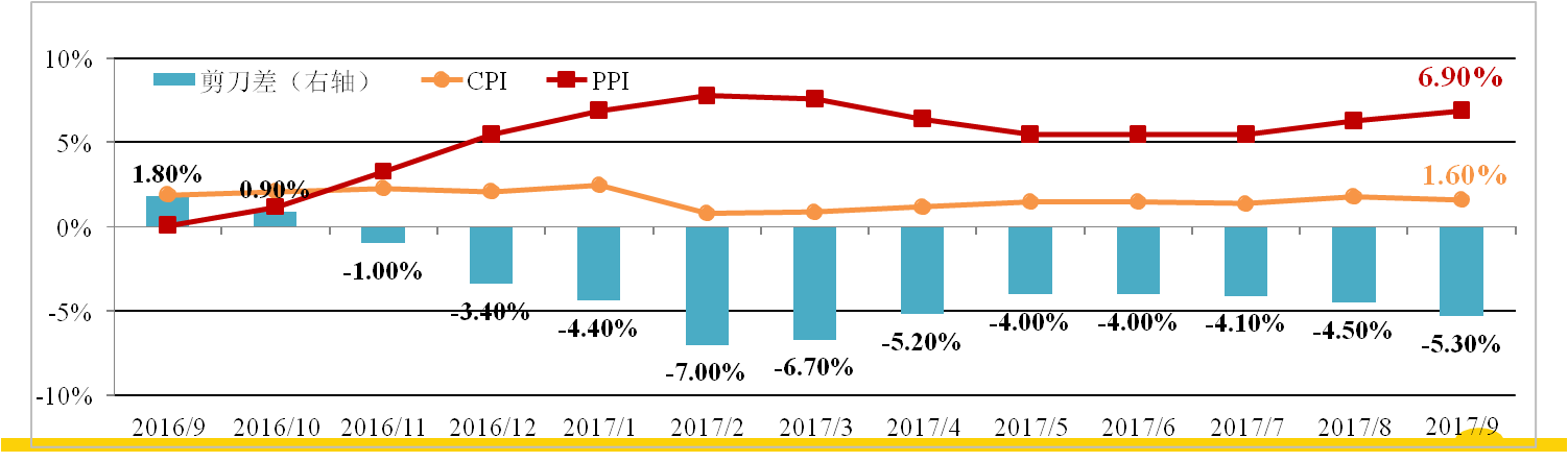 9月份我國CPI為1.6%,較上月縮小0.2個(gè)百分點(diǎn),略低于市場(chǎng)預期,蔬菜 價(jià)格增速大幅放緩是主要原因,而核心CPI從2.2%升至2.3%,顯示價(jià)格正向下 游傳導。 受9月上半月黑色、有色大漲影響,PPI為6.9%,大超市場(chǎng)預期。