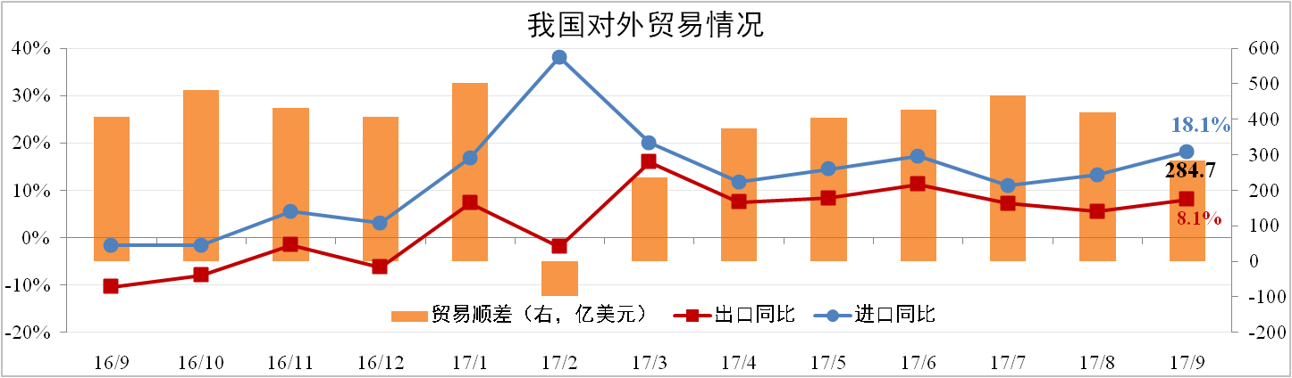 分析認為:9月進(jìn)口大幅上升一方面反映國內需求韌性較強,下滑不顯著(zhù),另一方面環(huán)保造成生產(chǎn)受限,需要更多的進(jìn)口來(lái)彌補國內生產(chǎn)的不足。對美順差擴大或對特朗普11月訪(fǎng)華提供談判籌碼,對出口造成不利影響。