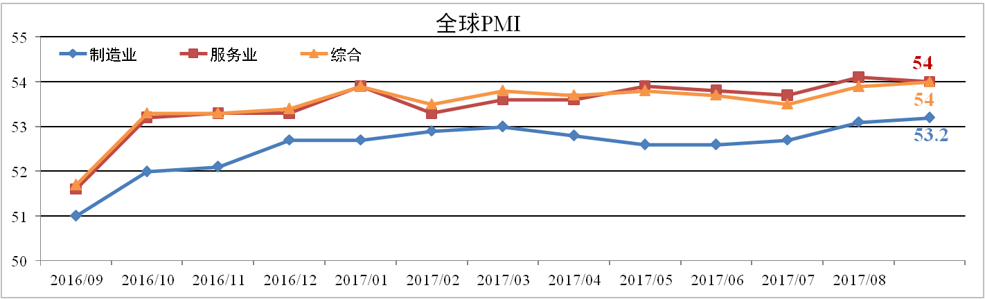據HIS  Markit與摩根大通發(fā)布的數據顯示,9月份全球綜合PMI為54,較8 月擴大0.1個(gè)百分點(diǎn)。其中服務(wù)業(yè)PMI為54,較上月下降0.1個(gè)百分點(diǎn),制造業(yè) PMI為53.2,均較上月擴大0.1個(gè)百分點(diǎn)。
