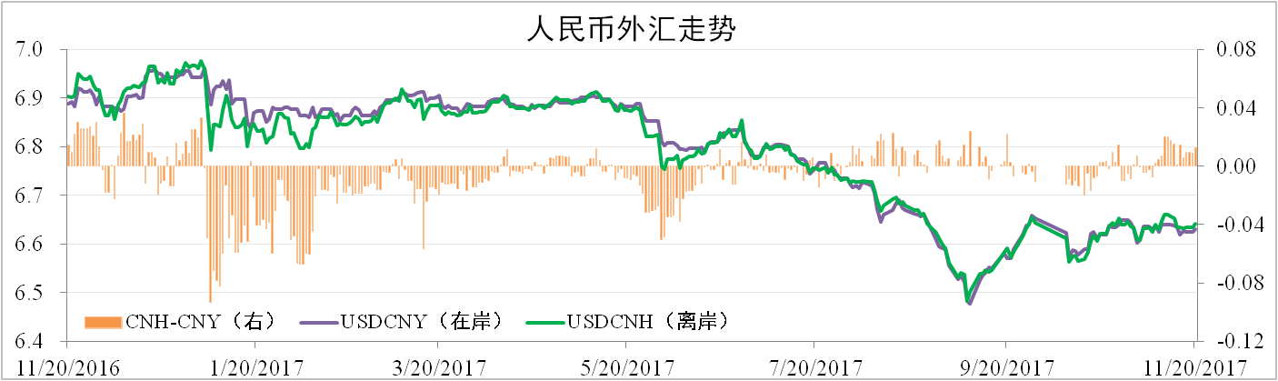 近期人民幣匯率整體維持震蕩走勢,一方面特朗普訪(fǎng)華達成匯率協(xié)調的共識,另一方面市場(chǎng)對中美兩國經(jīng)濟前景表現樂(lè )觀(guān)。截至11月20日,在岸人民幣報6.6299,環(huán)比微跌0.17%,離岸人民幣報6.6425,環(huán)比跌0.33%。