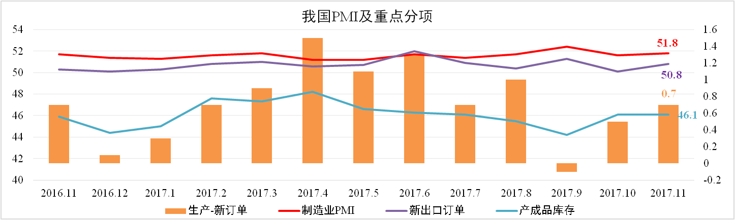 11月我國制造業(yè)PMI為51.8,較10月上升0.2。其中生產(chǎn)指數與新訂單指數差額擴大0.2至0.7,新出口訂單上升0.7至50.8,產(chǎn)成品庫存與上月持平于46.1。