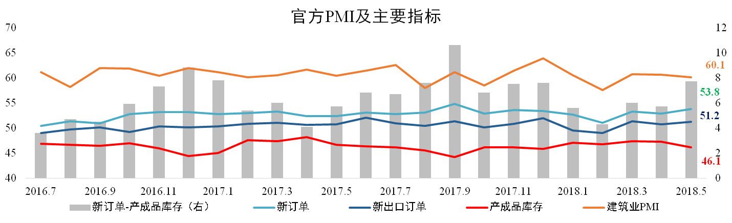 發(fā)稿時(shí)間:2018-06-225月份產(chǎn)成品庫存為46.1點(diǎn),較4月下降0.9個(gè)百分點(diǎn);新訂單為53.8點(diǎn),較上月上升0.5個(gè)百分點(diǎn),其中新出口訂單為51.2,較上月上升0.5個(gè)百分點(diǎn)。建筑業(yè)PMI延續下滑走勢,較4月下滑0.5個(gè)百分點(diǎn)至60.1點(diǎn)。