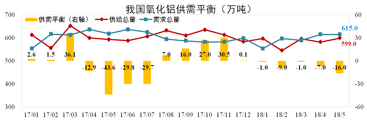 截至5月底,我國氧化鋁建成產(chǎn)能8167萬(wàn)噸,運行產(chǎn)能7297萬(wàn)噸,開(kāi)工率89.35%,環(huán)比上升1.17個(gè)百分點(diǎn)。其中國內氧化鋁產(chǎn)量607萬(wàn)噸,進(jìn)口氧化鋁8萬(wàn)噸,供給總量599萬(wàn)噸,測算的需求量為615萬(wàn)噸,理論短缺16萬(wàn)噸。