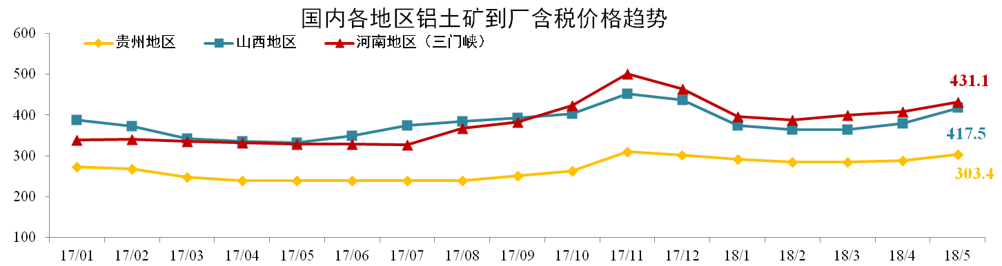 發(fā)稿時(shí)間:2018-06-225月份各地鋁土礦價(jià)格均小幅度增長(cháng)。截止2018年5月,貴州(AL:60%,A/S:5.5-6)到廠(chǎng)含稅價(jià)月均價(jià)303.4元/噸,環(huán)比上漲5.16%;山西鋁土礦417.5元/噸,環(huán)比上漲9.87%;河南鋁土礦431.1元/噸,環(huán)比上漲5.58%。