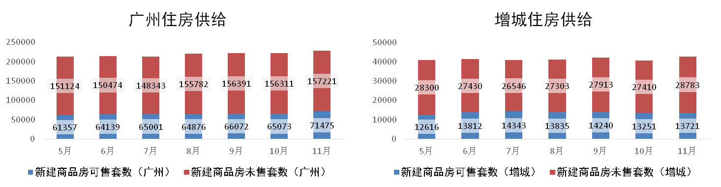 分析認為:由于本月全市住宅成交整體下降,加上供應保持水平量,致使市內庫存量上漲。同理,增城在11月以等待政策優(yōu)化為主基調,各樓盤(pán)推貨明顯放緩,區內庫存較上月有所增加。