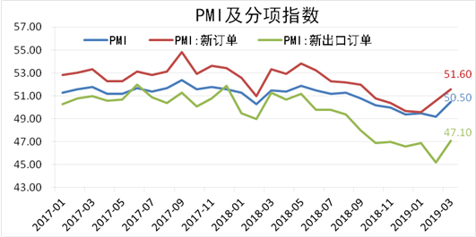 據國家統計局數據,3月PMI上升至50.5%,打破連續三月低于榮枯線(xiàn)下方的局面。分項來(lái)看,新訂單指數連續兩月上揚,預示著(zhù)制造業(yè)減稅降費等一系列積極的財政政策效果開(kāi)始逐步釋放。從需求方面來(lái)看,進(jìn)口、新出口訂單指數仍低于50%,在一定程度上說(shuō)明內外需均未發(fā)生實(shí)質(zhì)性改善,終端消費不振仍成為制約制造業(yè)擴張前景的重要因素。