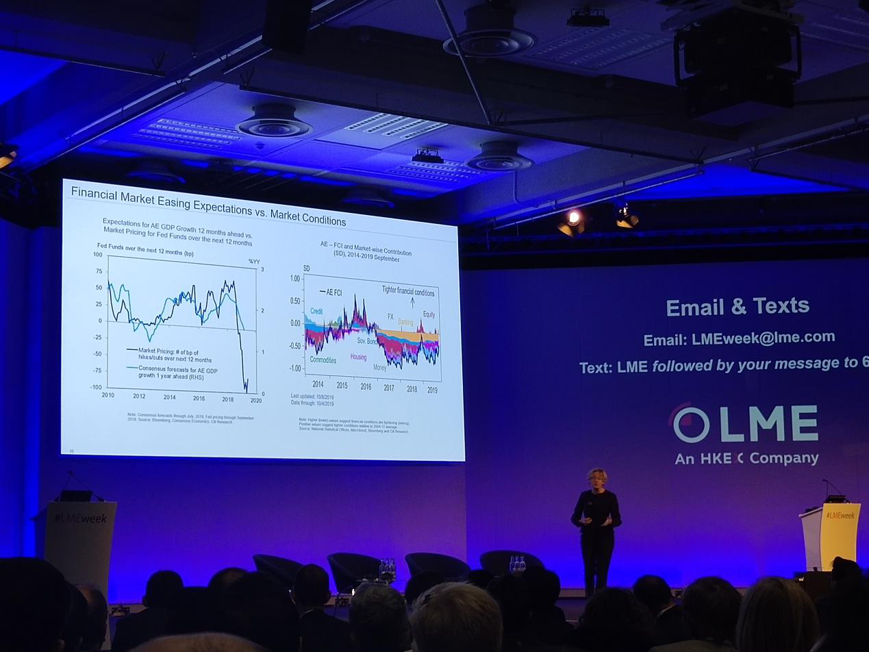 發(fā)稿時(shí)間:2019-10-312019年10月28日,一年一度的LME WEEK在英國倫敦正式召開(kāi)。上海金屬網(wǎng)對本次LME WEEK進(jìn)行全程報道,本文將為您帶來(lái)LME金屬研討會(huì )上的花旗銀行全球首席經(jīng)濟學(xué)家Catherine Mann關(guān)于“全球經(jīng)濟展望”的演講: